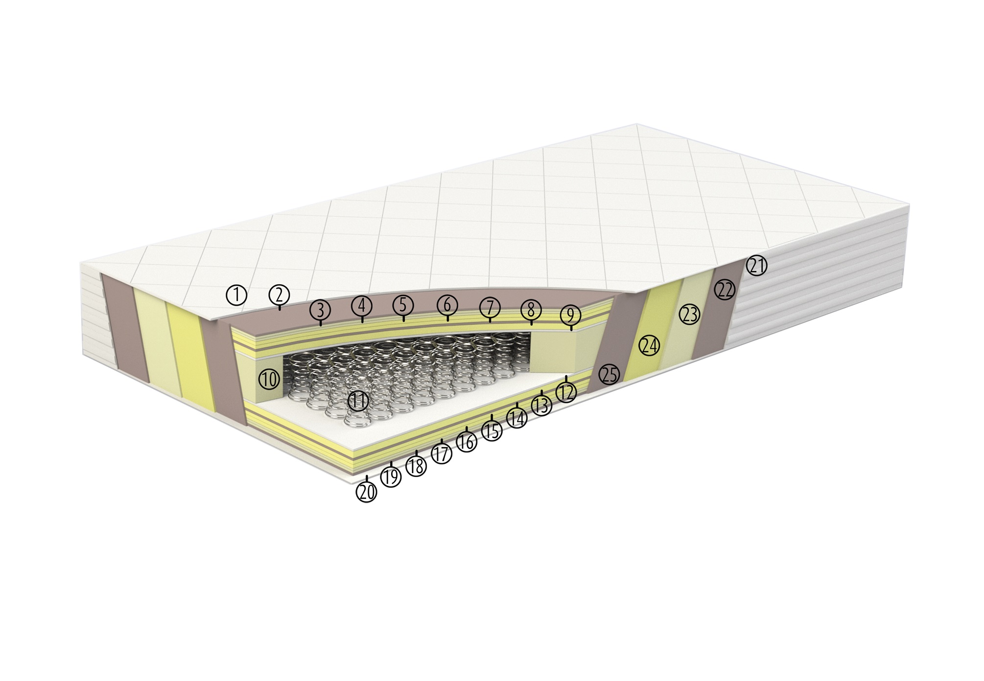 Zastosowane pianki wysokoelastyczne o różnych gęstościach oraz włókna silikonowe sprawiają, iż materac jest wysoce przewiewny a do tego zastosowana bawełna oraz owcza wełna zapewniają niezaburzony komfort i klimat snu.