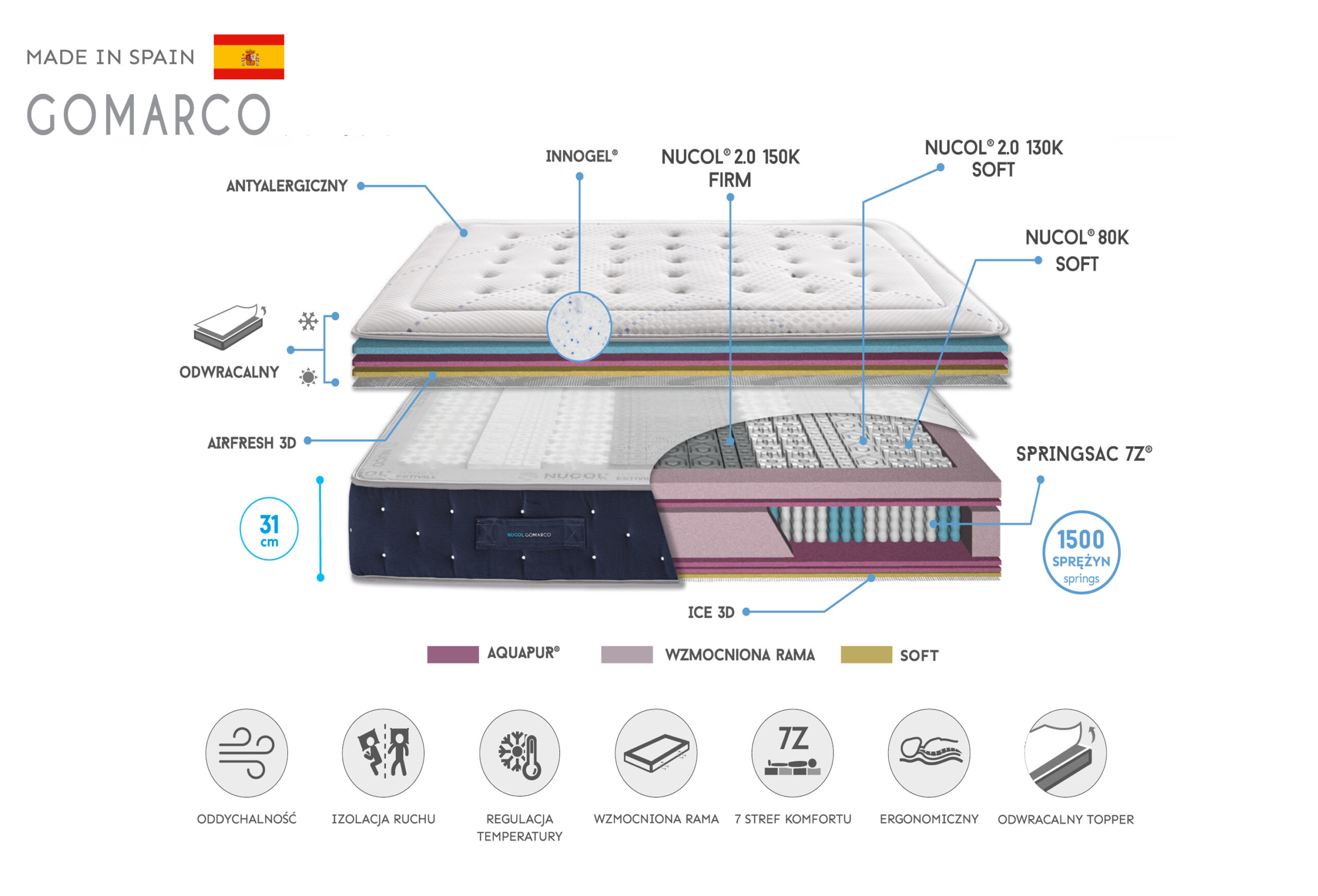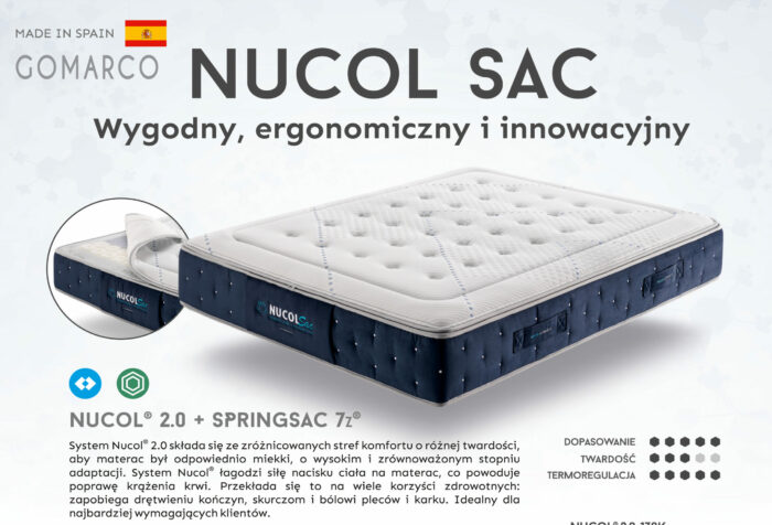 Nucal Sac to średnio twardy materac o wysokości 31 cm. Dzięki technologii Nucol produkt jest oddychający oraz nie dopuszcza do przegrzania, dając uczucie świeżości i chłodu. Powierzchnia jest miękka przy jednoczesnym niwelowaniu drgań, co zapewnia komfort spania nawet przy ruchu partnera. Materac jest również dostosowany do różnych warunków temperatury, ponieważ jego topper jest dwustronny, co umożliwia zmianę w okresie zimy/lata. Wbudowany wewnątrz materaca system masażu zapewni niesamowite odprężenie po całym dniu. System sterowny jest pilotem dzięki temu rodzaj, częstotliwość oraz moc wibracji możemy ustawić według własnego uznania i potrzeb. Produkt jest antyalergiczny.